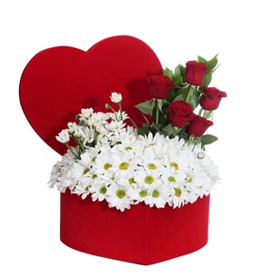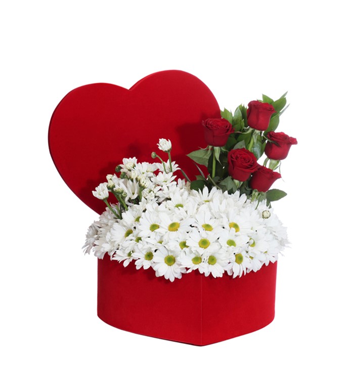 kırmızı kutuda papatya ve güller | Çiçek Vagonu