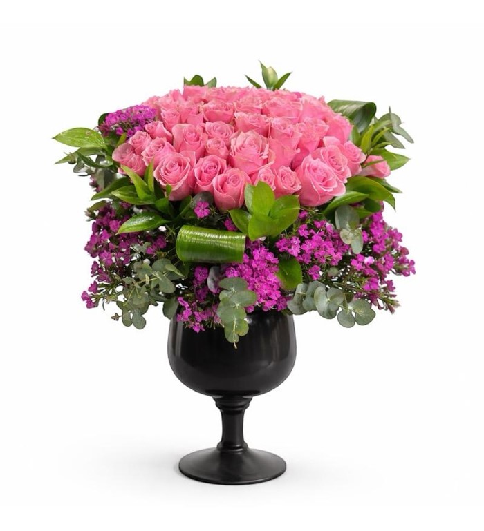 siyah kupada pembe güller ve okaliptus esintisi | Çiçek Vagonu